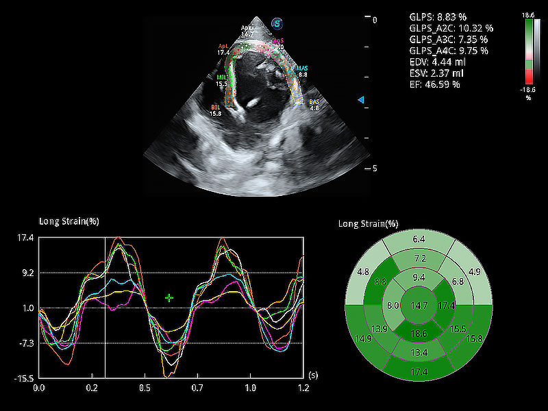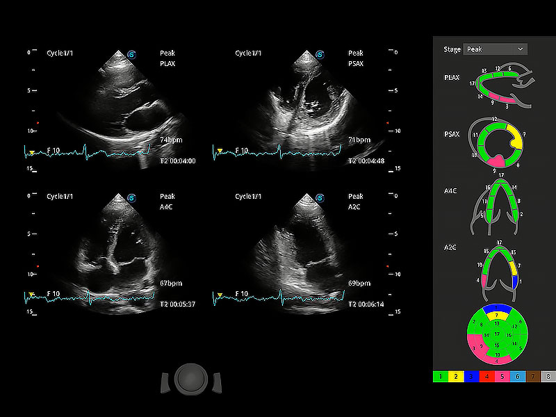 通过心肌识别技术与二维斑点追踪技术相结合,对心脏的超声图像进行量化分析。计算心肌17个节段的应变、应变率、速度、位移等,并通过牛眼图的形式进行呈现。