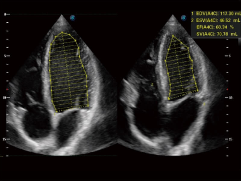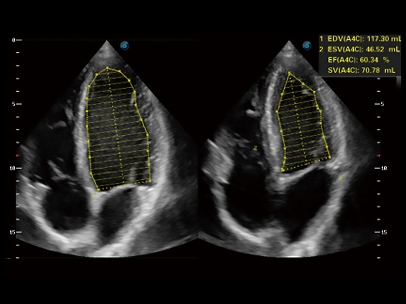 能够基于左心室壁追踪和辛普森法,自动计算射血分数,支持多个可移动点描迹,与手动测量相比,极大节省了动物医生的时间和精力。