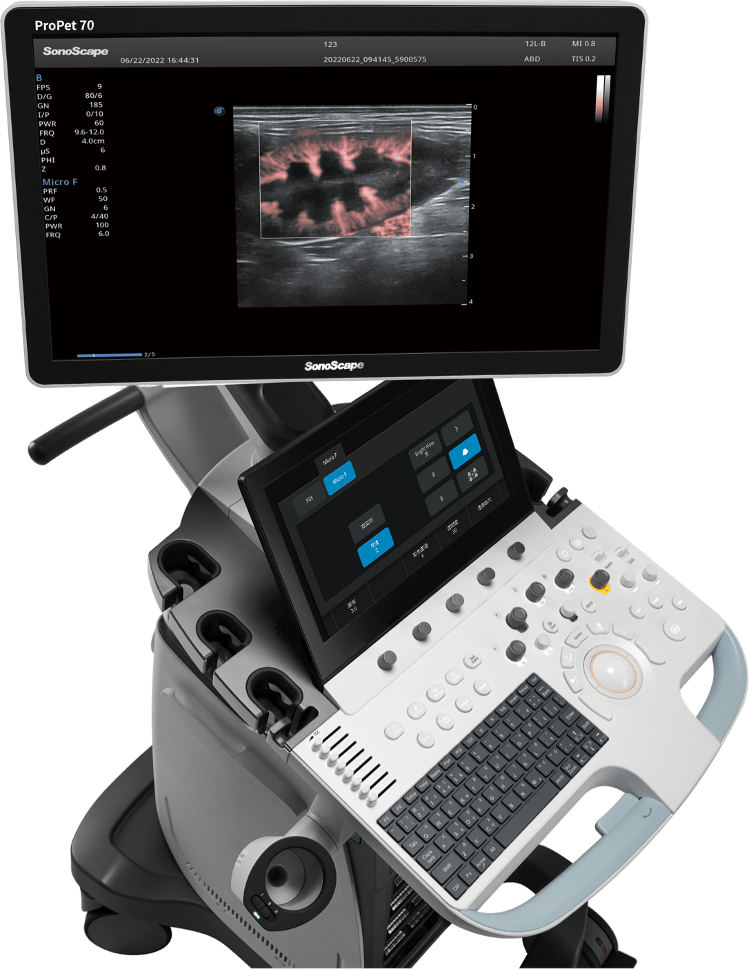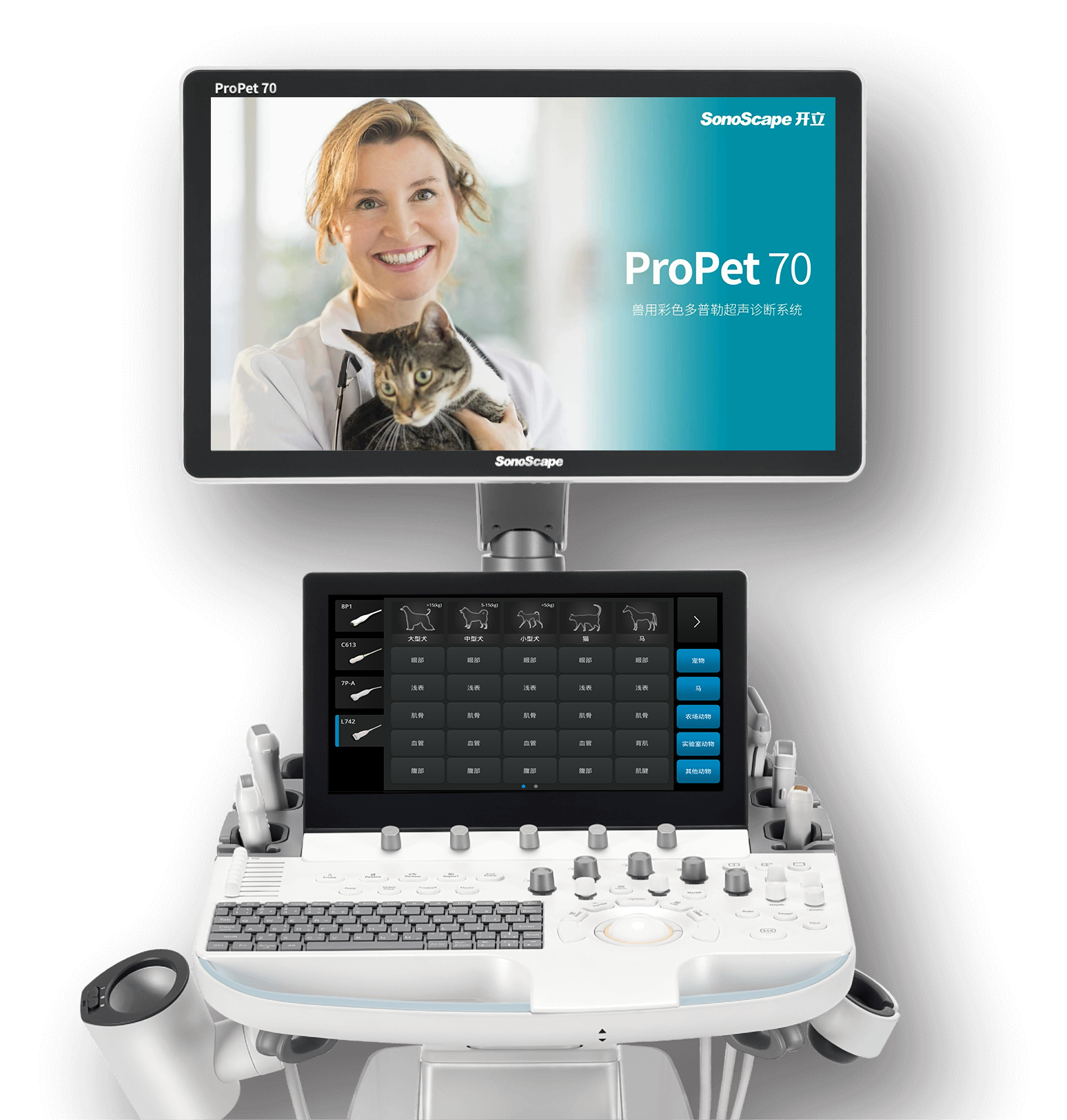 ProPet 70 全新的动物超声智能软件和丰富的探头群,为动物医生提供了高清晰度和精细分辨率的图像,无论在宠物、马科、畜牧还是实验室动物等应用中都可以轻松应对,为您的日常工作带来满意的体验。