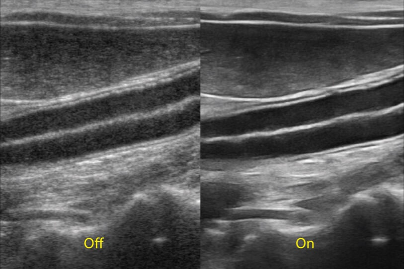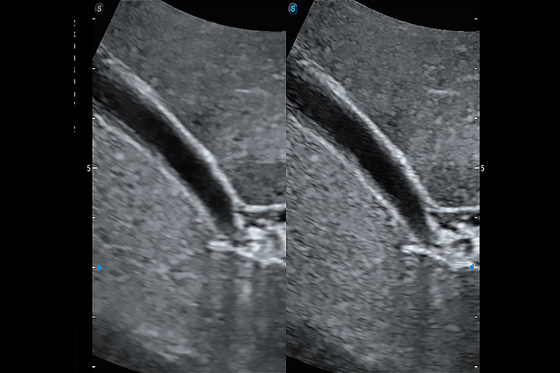 ProPet 70 进一步提升了微米成像算法,更加注重对基础原始图像的还原和保留,在有效减少斑点噪声、增强组织边界显示的同时,避免过度优化丟失真实的解剖信息。