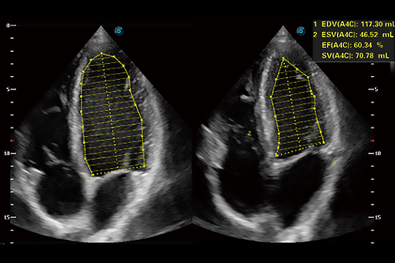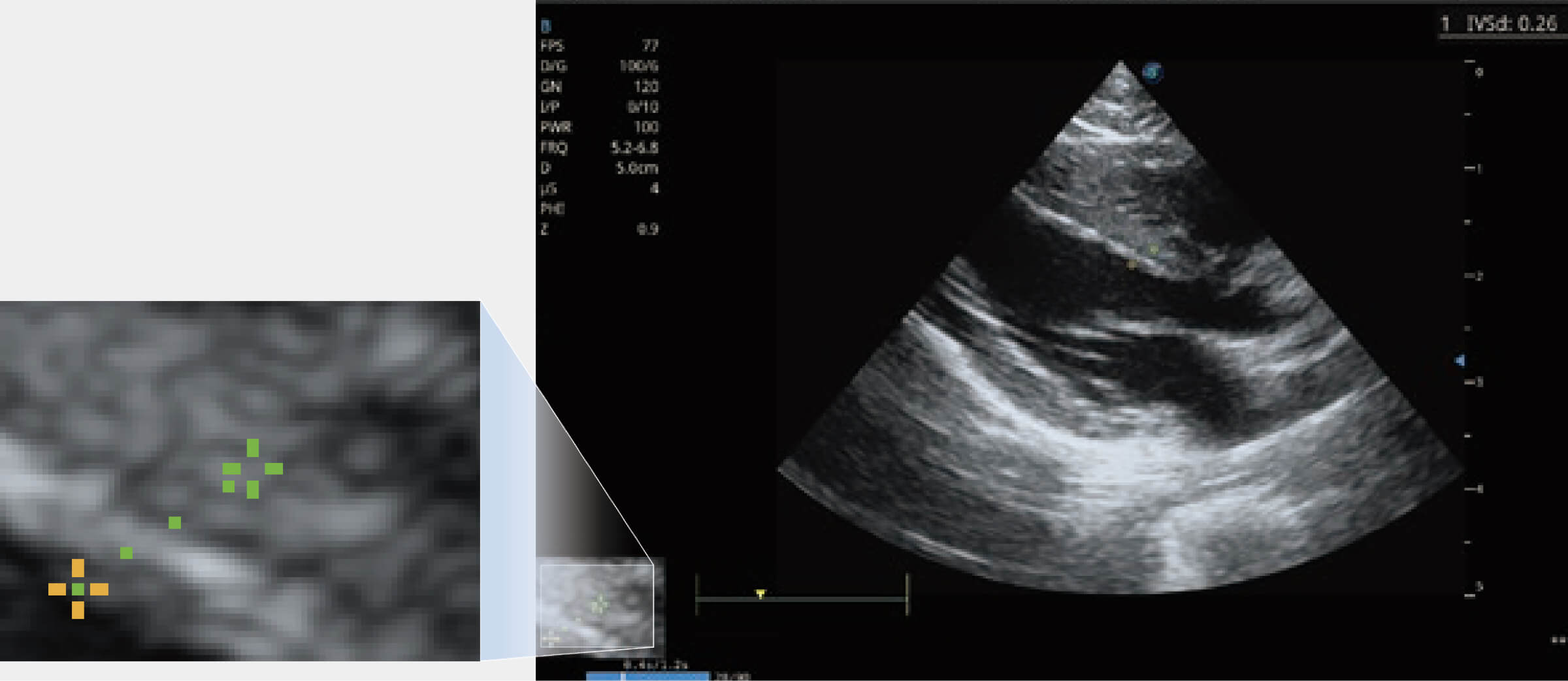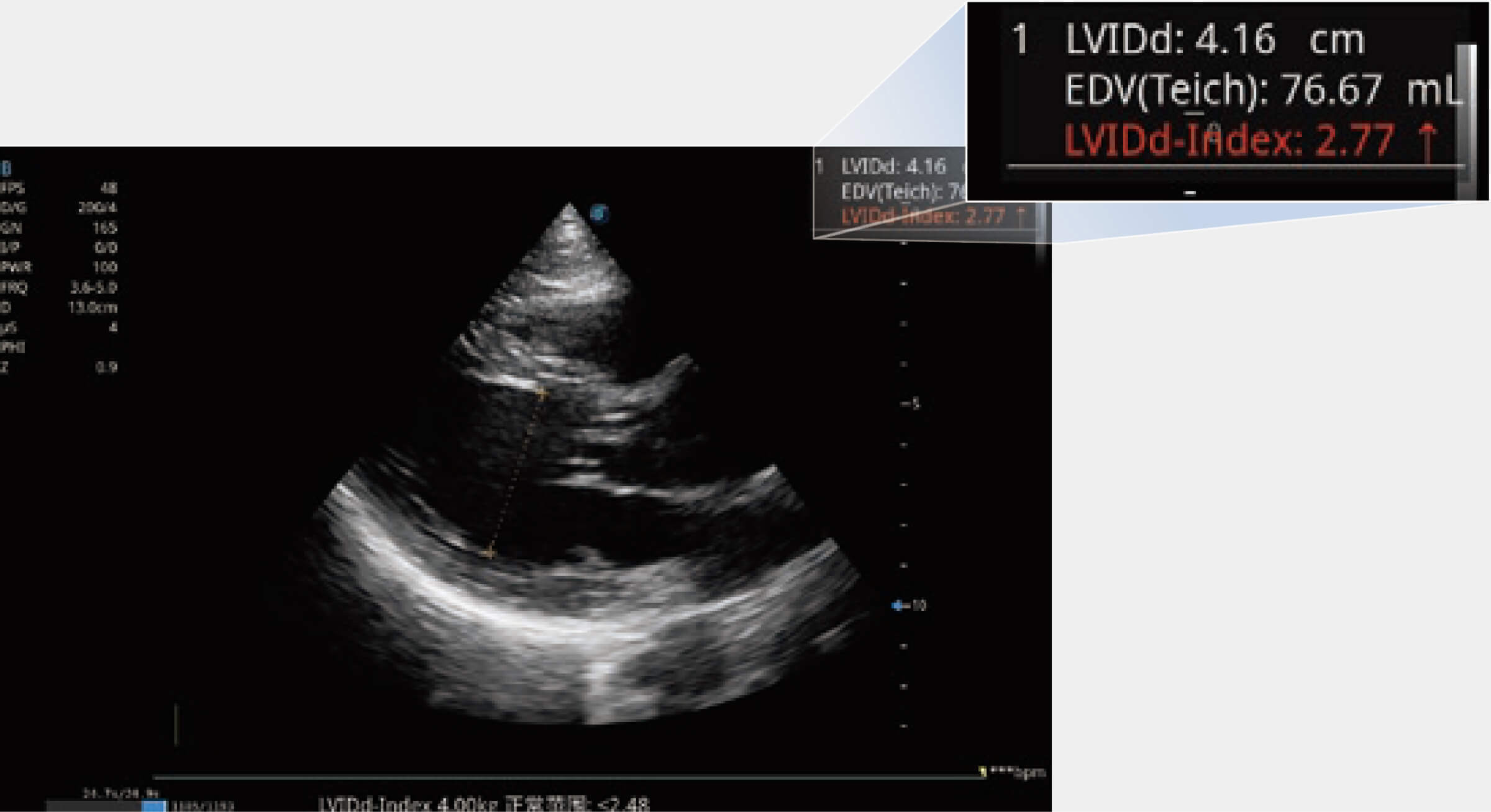能够基于左心室壁追踪和辛普森法,自动计算射血分数,支持多个可移动点描迹,与手动测量相比,极大节省了动物医生的时间和精力。