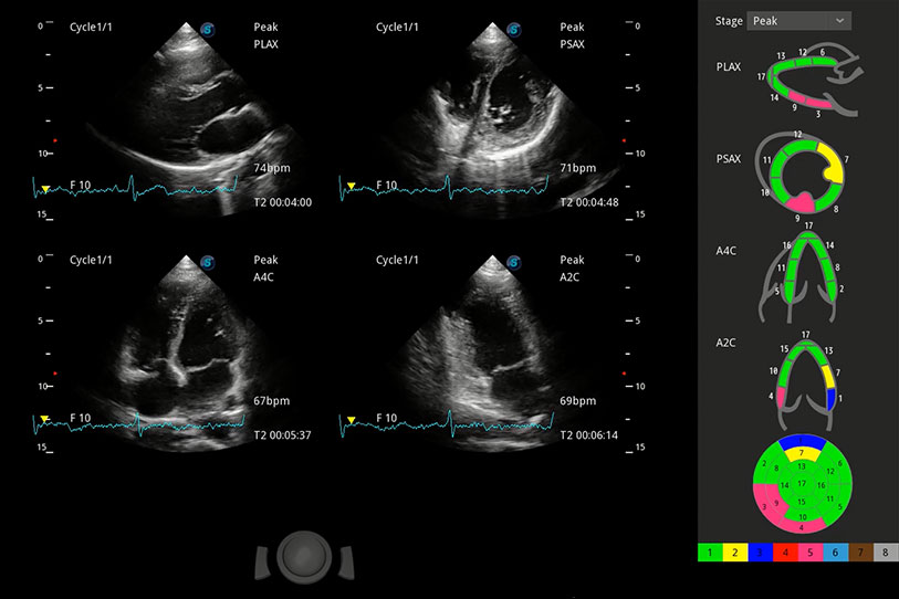 实时用颜色表示心肌组织运动,观察和定量组织的运动情况,对快速检测与评估心肌的灌注和活性、电传导及心肌收缩和舒张功能等均能提供重要的诊断信息。