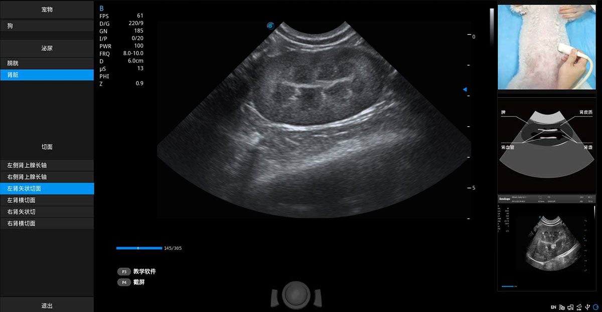 提供解剖示意图、标准超声图像、扫查手法图和操作者实时检查图像,指导操作者进行标准切面的正确扫查。